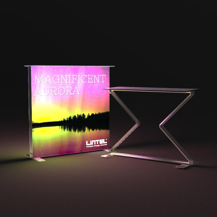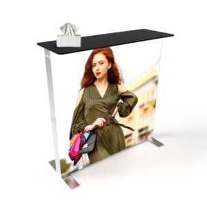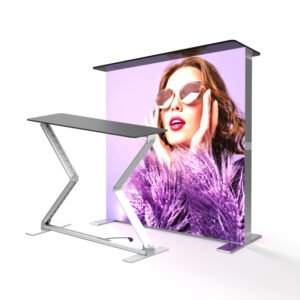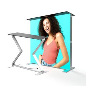 Moderan LED promotivni pult koji kombinira funkcionalnost recepcijskog stola i atraktivne backlit grafike. Sklopiva konstrukcija omogućuje montažu u svega nekoliko sekundi bez alata, dok integrirano LED osvjetljenje ravnomjerno osvjetljava grafiku i čini brend vidljivijim na sajmovima, promocijama i eventima.