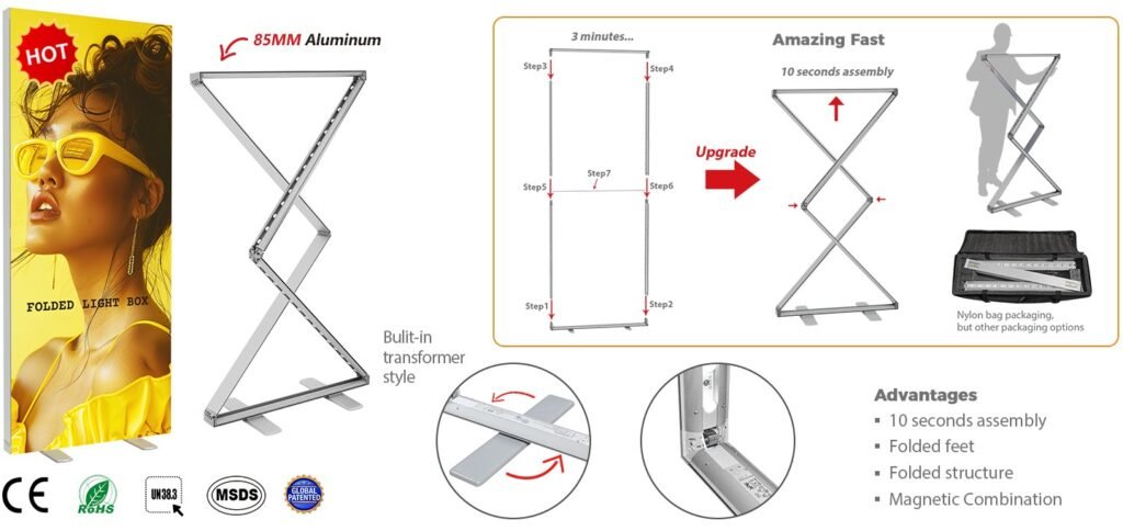 Praktičan sklopivi LED lightbox sustav namijenjen za sajmove, promocije i evente gdje je važna brza montaža i jednostavan transport. Zahvaljujući inovativnoj folding konstrukciji, okvir se otvara u nekoliko sekundi bez potrebe za alatima, dok integrirano LED osvjetljenje ravnomjerno osvjetljava SEG tekstilnu grafiku i stvara snažan vizualni efekt.