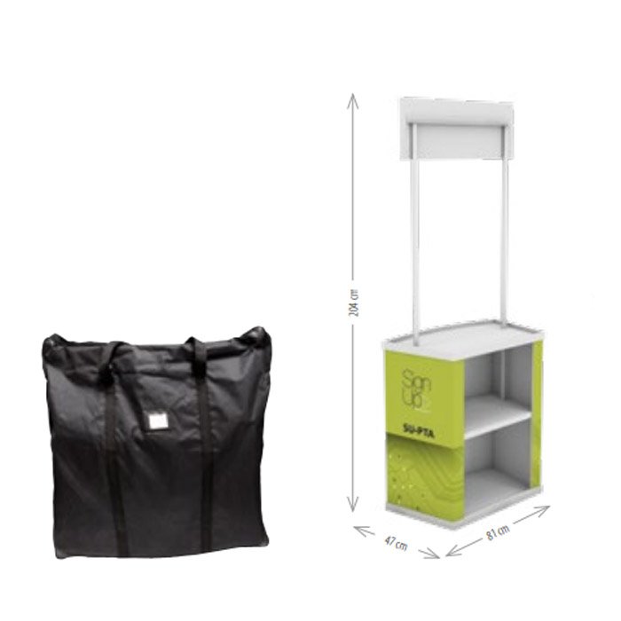 Promotivni stolić s blago zaobljenom prednjom stranom, izrađen je od izuzetno otpornog i laganog plastičnog materijala. S unutrašnje strane stolić ima prostranu policu za odlaganje letaka i ostalog promotivnog materijala. Za lakši i sigurniji transport, uz stolić dolazi i transportna torba za praktično prenošenje. Izvrsno rješenje za razne prezentacije te degustacije proizvoda.