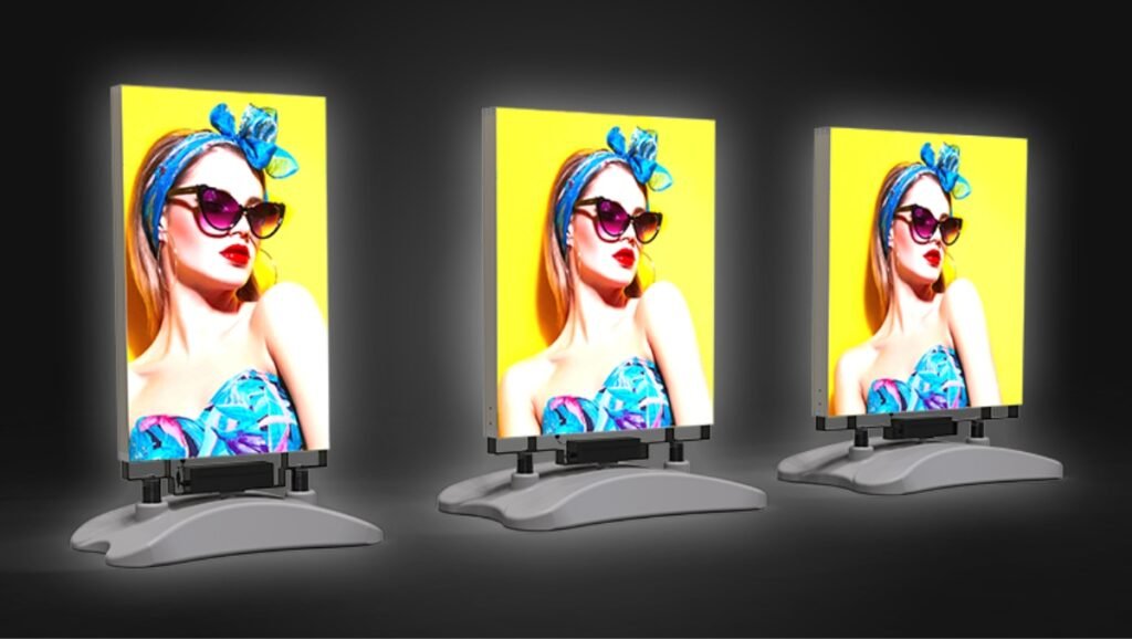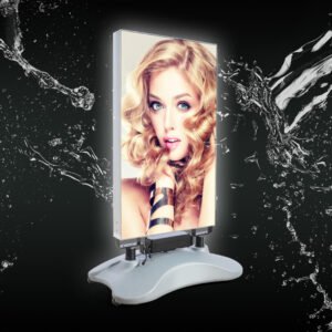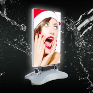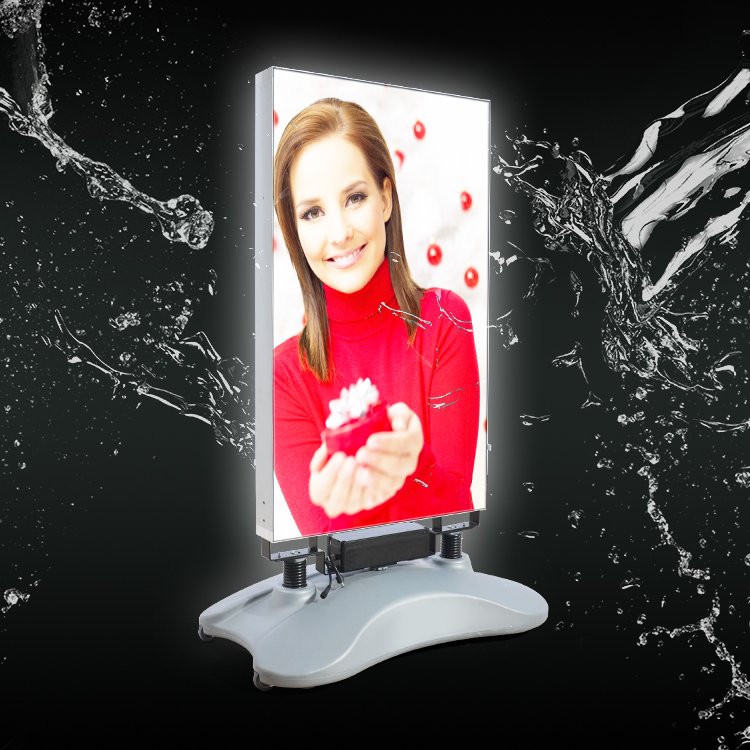 Vanjski LED lightbox dizajniran za promociju na otvorenom prostoru, poput ispred trgovina, restorana ili na događanjima. Vodootporna konstrukcija, punjiva baterija i stabilna baza koja se puni vodom omogućuju sigurno korištenje i u zahtjevnijim vremenskim uvjetima, dok osvijetljena SEG grafika osigurava jasnu i vidljivu poruku danju i noću.